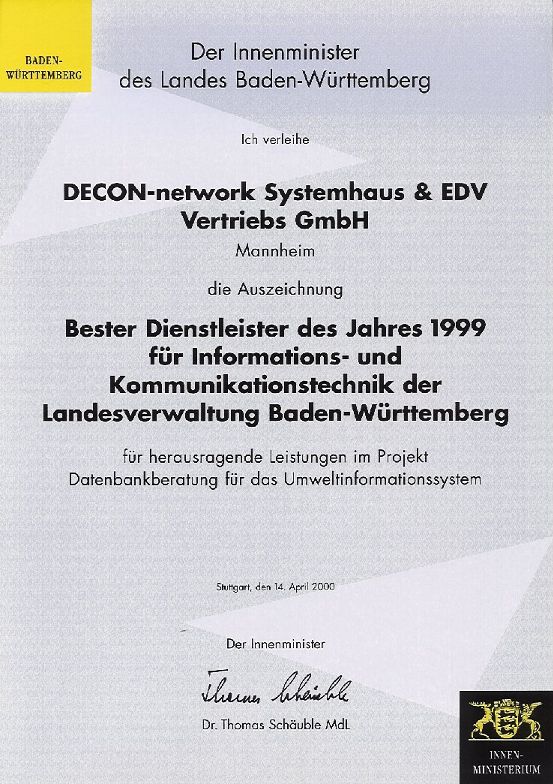 "Bester Dienstleister des Jahres 1999 für Informations- und Kommunikationstechnik der Landesverwaltung Baden-Württemberg"